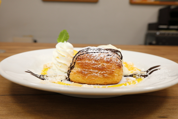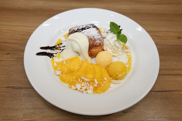 マンゴーやマンゴーソルベ、マンゴーソースなど、マンゴーを使った素材を彩りよく盛り合わせています。焼きたてのデニッシュに、すっきりとした味わいのレモンチーズクリームがとろ〜り。