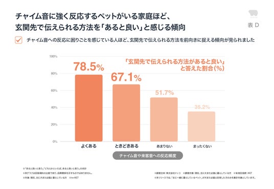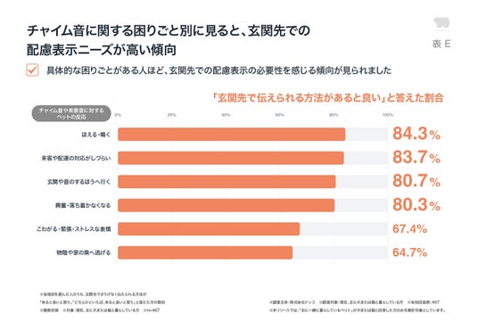 また、「ほえる・鳴く」と答えた人では84.3%、「来客や配達の対応がしづらい」と答えた人では83.7%が、玄関先での配慮表示を前向きに捉えていました。
