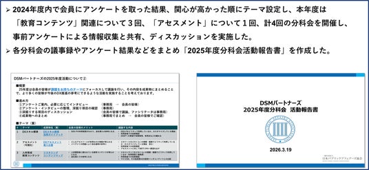 今次会合はDSMパートナーズ2025年度の活動報告会として、まず事務局からDSMパートナーズの2025年度の活動について報告しました。