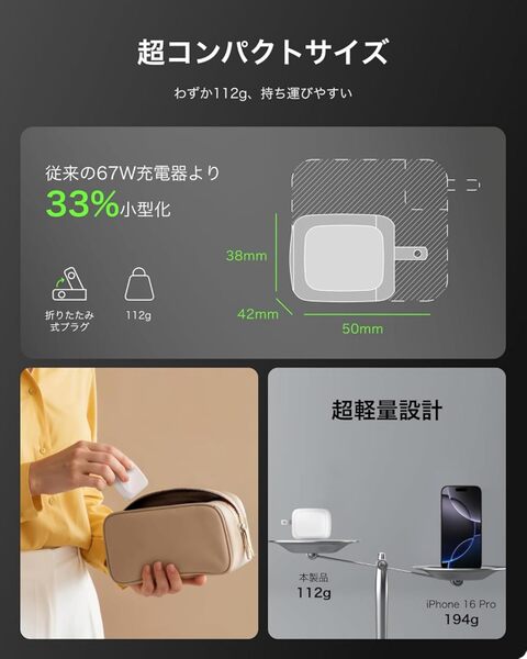 スマートフォン向けの小型充電器では出力不足になりがちなノートPC用途まで視野に入れやすく、USB-C充電環境を整理したい人に扱いやすいスペックです。