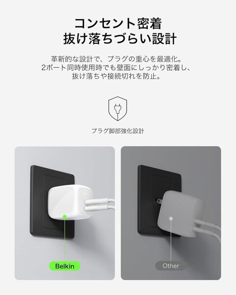 もう一つ、地味なポイントではありますが、2台同時充電時でも抜け落ちや接続切れを防ぎやすい設計なんだそう。壁コンセントに挿したときの安定性は、複数ポート充電器では意外に使い勝手を左右する部分です。