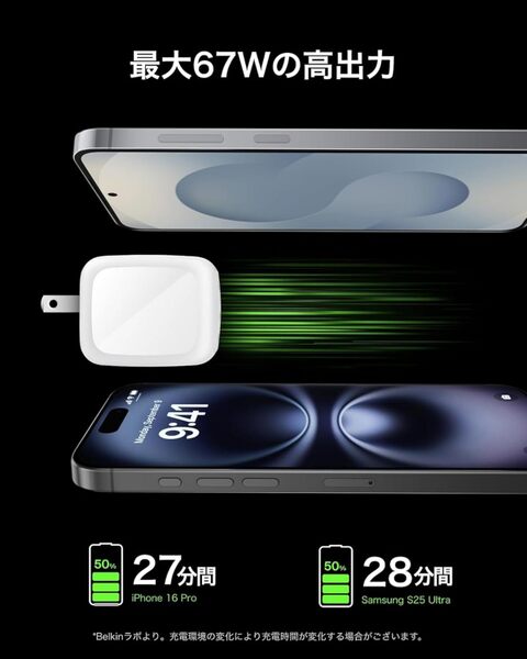 Belkin CubicCharger 67W 2ポート アダプター「WCH020qcWH」のわかりやすい強みは、単ポート使用時に最大67W出力へ対応している点。