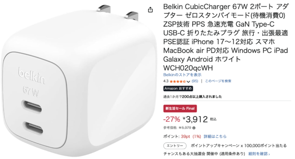 ノートPCもスマホもこれ1台。Belkinの2ポート充電器、セールだから買っちゃう?