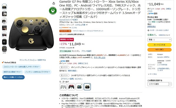 Amazon.co.jpにて、GameSirのXboxコントローラー「GameSir G7 Pro(ゴールド)」が販売中だ。参考価格は1万2999円だが、「新生活セール Final」により15%オフの1万1049円で購入できる(4月3日時点)。