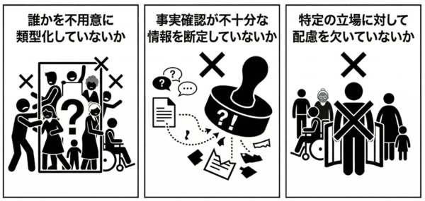 「誰かを不用意に類型化していないか」「事実確認が不十分な情報を断定していないか」「特定の立場に対して配慮を欠いていないか」。