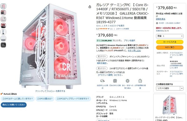 Amazon.co.jpにて、GALLERIAのゲーミングデスクトップPC「GALLERIA CRA5C-R56T」が販売中だ。価格は37万9680円。