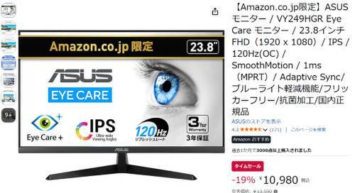 ASUSの「VY249HGR Eye Care モニター」がAmazonタイムセール対象。参考価格13,590円のところ、19%オフの10,980円で販売中。