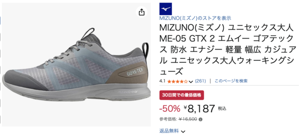 ミズノのME-05 GTX II ウォーキングシューズが、Amazonで50%OFFの8,187円で販売されています!