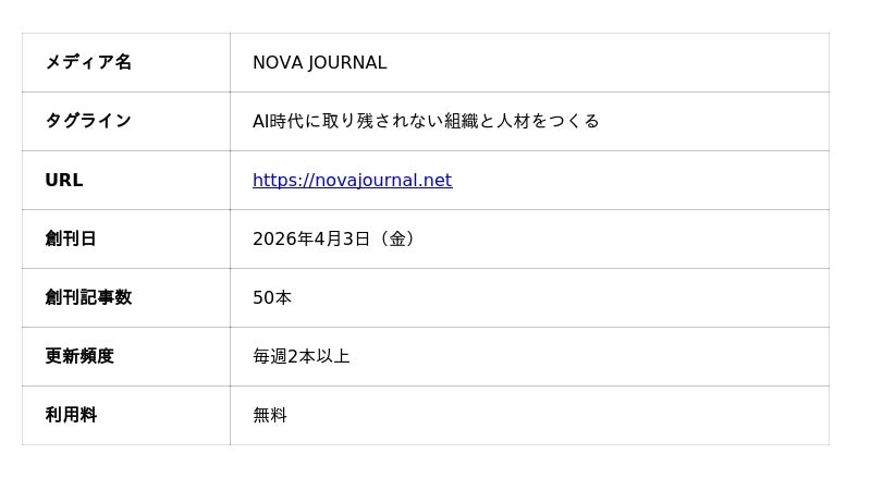 生成AIサービス開発を手掛ける株式会社SUPERNOVA(本社:東京都港区 代表取締役社長 木本 東賢 以下、当社)は、AI時代に取り残されない組織と人材をつくることを目的としたWebメディア「NOVA JOURNAL」(https://novajournal.net)を2026年4月3日(金)より提供開始します。