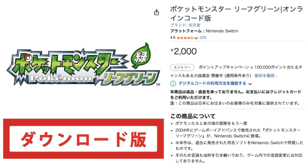 というわけで、今回は「ポケットモンスター リーフグリーン|オンラインコード版」を取り上げましょう。AmazonでNintendo Switchのダウンロード版が2,000円で購入できます。