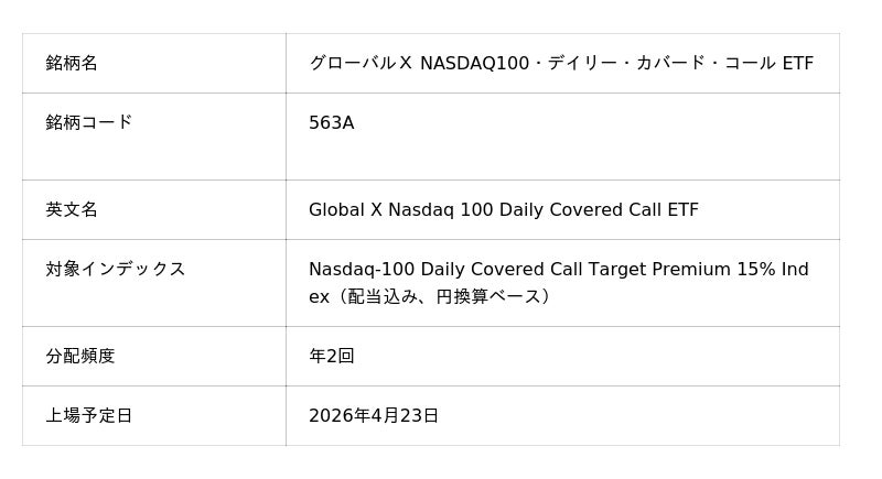 大和証券グループのGlobal X Japan株式会社(東京都千代田区、代表取締役社長:藤岡 智男、以下「当社」)は、本日、東京証券取引所より「グローバルX NASDAQ100・デイリー・カバード・コール ETF」(銘柄コード:563A、以下「当ETF」)の上場の承認がなされたことをお知らせします。