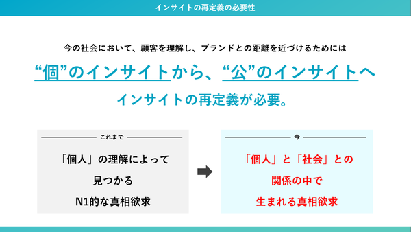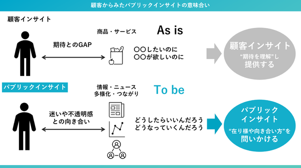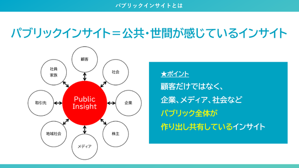 「パブリックインサイト」は、顧客だけでなく企業や社会、メディアなど社会が共有している「モヤモヤ(隠れたホンネ)」を言語化するというアプローチ。従来の顧客インサイトが「商品・サービスへの期待」であり、これを理解して期待に応える商品・サービスを提供することで効果を生むものだとすれば、パブリックインサイトは「社会全体のモヤモヤを言語化し共感をもたらす」ものだとしている。