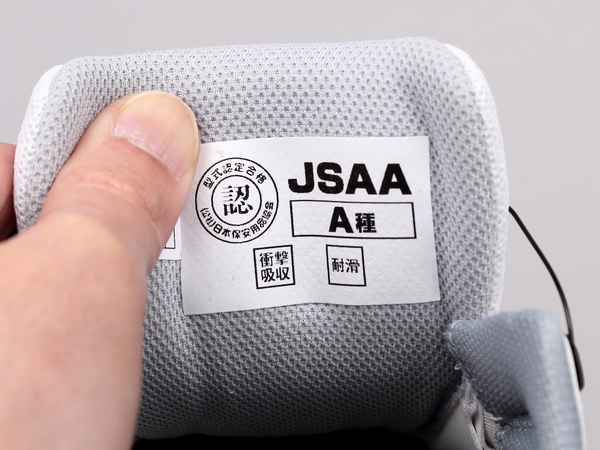 スニーカーのように見えながらも、JSAA規格A種ですから、耐圧迫性10kN(約1トン相当)、耐衝撃性70Jをクリアしています。靴のつま先部分に足をのせ、体重をかけてみましたが、当然ながら、潰れることはありませんでした。