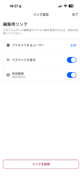 作成した共有リンクが不要になった場合は、手作業で削除できます。共有リンクを作成済みのフォルダで「共有」ボタンをタップし、「設定を変更」をタップして「リンクを削除」を選べば、共有リンクが無効になります。