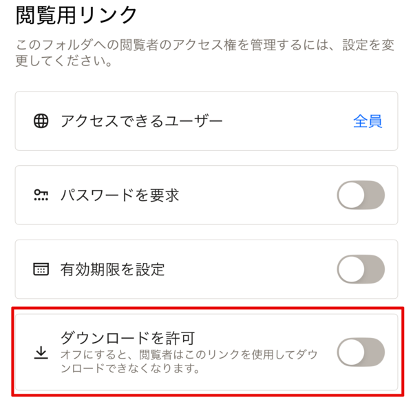 共有リンクのURLには、第三者が推測してアクセスできないように長くてランダムな文字列が使われます。ただし、それだけではセキュリティが心配な場合もあるでしょう。