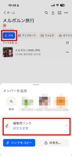 フォルダの共有リンクを作る際は、共有したいフォルダを開いて「共有」ボタンをタップします。画面下部のメニューに表示される「編集用リンク」をタップして、共有方法を「編集用リンク」または「閲覧用リンク」から選びます。