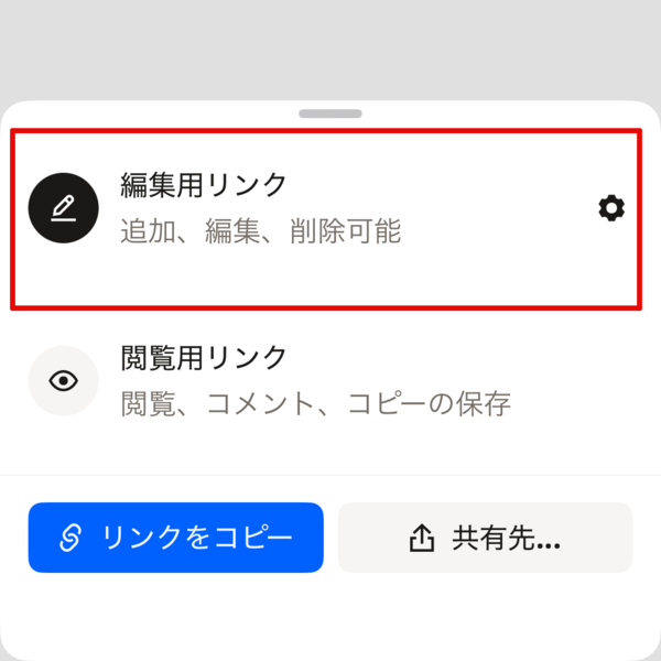 最後に「リンクをコピー」をタップして、共有リンクのURLをLINEやメールなどにペーストして、共有相手に送りましょう。なお「共有先」ボタンをタップすれば、スマホの共有メニューが開いて、より素早く送信することができます。