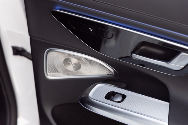 メルセデスの室内といえばイルミネーション。一時期はギラギラしていましたが、Eクラスは少し大人しくなったような気がします。ミラー下あたりにパターンプロジェクターが用意され、スリーポインテッドスターがお出迎え。ドアも光り、スペシャル感がアリアリです。