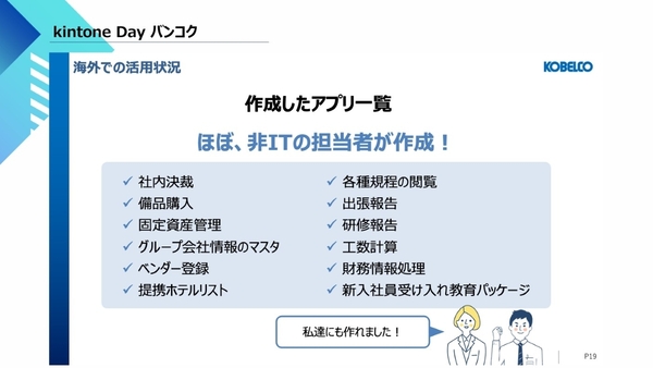 KOBELCOでは国内のDX戦略においても、ノーコードツールによる市民開発を掲げている。こうして先行する日本と海外拠点との“DXのギャップ”を埋めるのが、kintone導入の目的だ。さらに、同社が率先して成功事例を生み出し、それをテンプレート化して各拠点に横展開していくことも見据えていた。