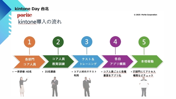 導入にあたっては、1400名の社員のうち各部門からコア人材を選出して、トレーニングを実施。そのコア人材が中心となってkintoneアプリを作成し、IT部門で最終チェックをするというプロセスを採用した。このプロジェクトは、パートナーである富士フイルムビジネスイノベーションが支援している。