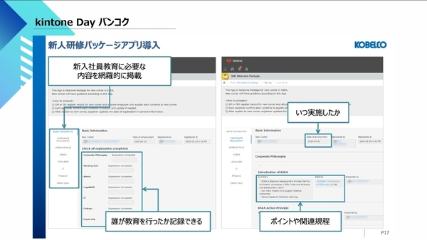 その成功事例の一つとして紹介されたのが「新人研修パッケージ」アプリだ。以前は、紙とExcelで研修を管理していたため、指導内容や進捗が把握できず、必要な情報が網羅的に伝わっているか革新を持てない状況だったという。