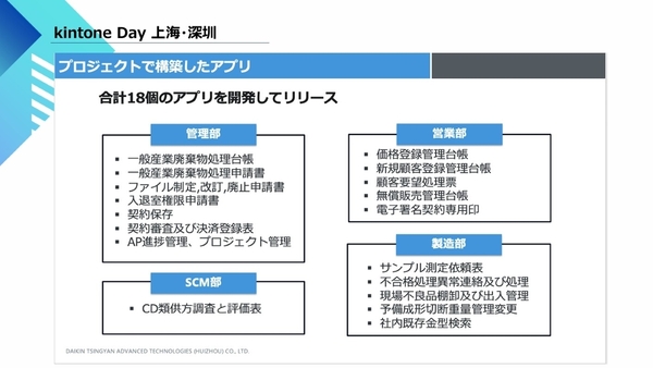 プロジェクトは管理部や営業部、製造部、SCM部を巻き込み、各部から選出された8名で発足。その大半がIT知識のないメンバーだったが、林氏が要件定義からアプリ公開に至る開発フェーズを丁寧にレクチャー。その結果として18個ものアプリが生まれている。