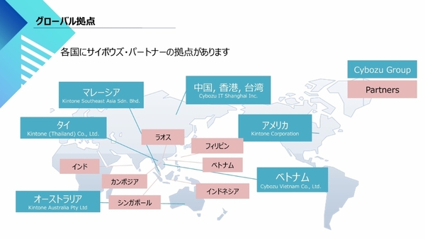 サイボウズでもグローバルでのサポート体制を強化しており、今回、事業責任者が登壇した中国や台湾、タイ、マレーシアに加えて、アメリカやベトナム、オーストラリアにも拠点を構える。さらには、各国ではkintoneの導入・活用を支援するパートナー企業とも連携し、kintoneの現地語対応も拡充しているような状況だ。