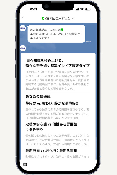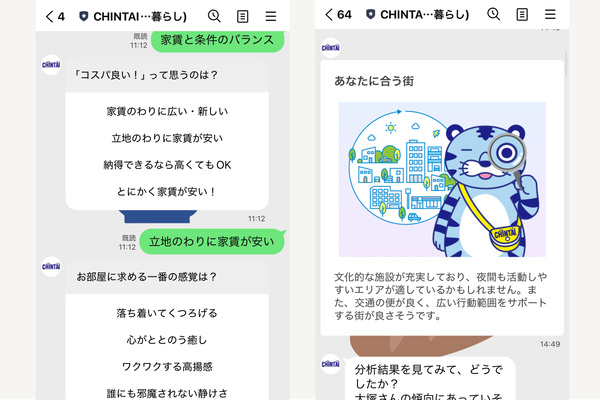 CHINTAIエージェントは、LINEを通じて提供されます。部屋を探すユーザーが会員登録をすると、まずはAIからいくつかの質問が届きます。それに答えると、AIがユーザーの価値観や暮らし方の傾向を理解して、定期的に「おすすめの部屋」を提案してくれるようになります。