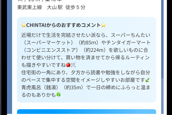 ユーザー一人ひとりのライフスタイルに合わせ、周囲の街の雰囲気なども分かる「おすすめコメント」が届きます