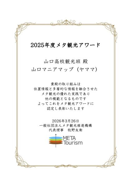 *「ヤママ(Yamama / 山口マニアマップ)」は、山口県立山口高等学校の生徒たちが開発した多層型観光マップ。山口県主催の「若者活躍による観光力パワーアップ事業」を通じて誕生したこのツールは、単なる観光案内ではなく、高校生ならではの視点で地域の魅力を「歴史」「日常」「エモさ」などの複数のレイヤー(層)で可視化したデジタルアプリ。その革新的な点は、大人の用意した枠組みを超え、生徒自らが公開APIを使いこなしてシステムを「自走」させた点にある。この主体性とメタ観光への深い理解が評価され、「メタ観光アワード2025」を受賞した。若者の感性で地域の価値を多層的に捉え直した「ヤママ」は、2026年現在の観光DXにおける、次世代の担い手によるボトムアップ型モデルの象徴となっている。