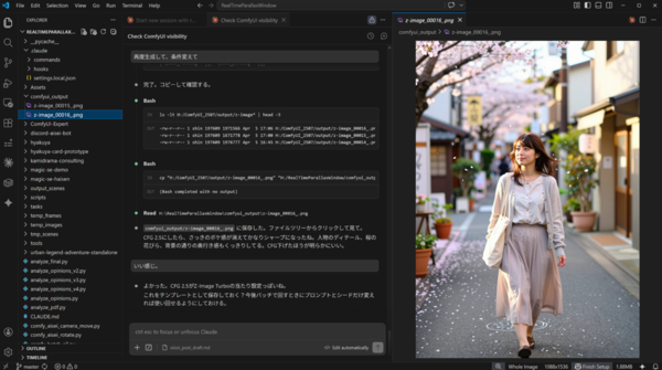 そうすると、Claude Codeは直前に生成したログデータから情報を把握し、そのWorkflowを生成可能になります。「シード値を変えて、同じプロンプトで生成して」と指示すると、ComfyUIに直接指示して、画像を作り出します。生成した結果は、ComfyUIのOutputフォルダに生成されますが、筆者はVSCodeで見たいため、終了後にコピーして、直接見ることができるようにしました。さらに、テンプレートとしてWorkflowをJSONとして保存するように指示しました。