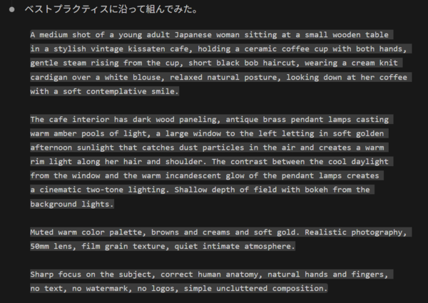 まず、Z-Image Turboのプロンプトガイドが存在しないかWeb検索をして探させます。その結果、GitHubにコミュニティにより開発されたilluminatianonさんがまとめているプロンプトガイドが英語で存在していたため、そこから「Z-Image Turbo ベストプラクティスガイド」をMDファイルとしてまとめさせました。それによると、Z-Image Turboは、ポジティブプロンプトに以下の全部のプロンプトを盛ると、効果が出やすいということがわかりました。