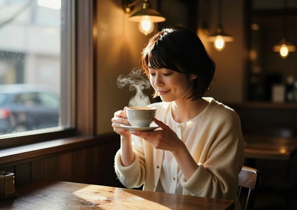 ただ、この複雑な設定を気にする必要はありません。「ベストプラクティスを参考に、おしゃれな喫茶店でコーヒーを飲んでいる日本の若い女性の画像のプロンプトを検討してくれる?ライト演出をうまく描いてね」と指示を出しました。その結果、長いプロンプト案が英語で出てきました。そして、「それを横長で生成して」と指示すると、Claude CodeはComfyUIを使って画像を生成しました。その結果は、かなり意図通りになっています。