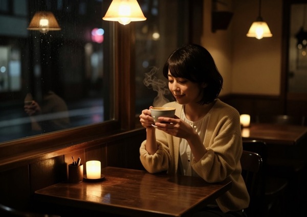 さらに「同じ設定で、夜にして、部屋の明かりや静かな雰囲気をうまく描いて」と指示すると、次のような画像になります。AIは読み込み時に内容を解釈できるので、以下のようなコメントを付けてきました。「窓の外の雨の夜景、ガラスに映るネオンの反射、ペンダントランプの琥珀色、テーブルのキャンドル、暗がりに浮かぶ顔——全部入ってる。最後の客感がしっかり出てるね」