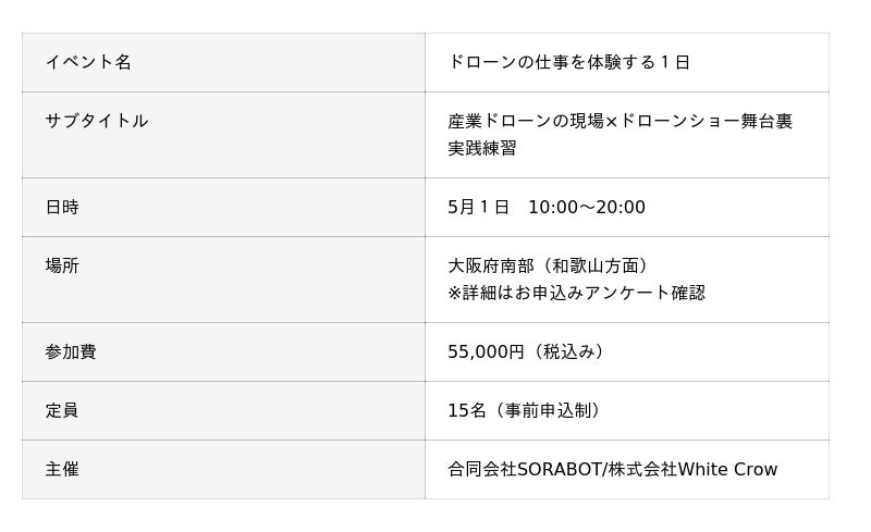 合同会社SORABOT(神奈川県横浜市)と株式会社White Crow(大阪府大阪市)は、ドローン事業への参入を検討する社会人を対象とした実践型1日講習「ドローンの仕事を体験する1日」を共同開催します。 本講習では、産業ドローンの現場実務とドローンショーの準備・本番運営という、ドローン業界のリアルな現場を1日で横断的に体験できます。「ドローンに携わりたいが、何から始めればよいかわからない」という方が、現場を知り、キャリアの方向性を見極めるための場として設計されています。