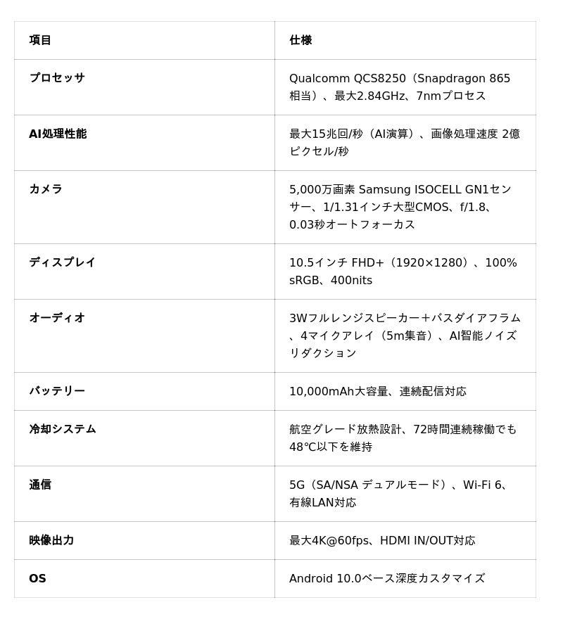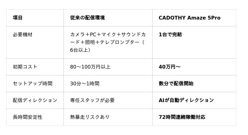 CADOTHY Amaze 5Proは、Cadothy社が開発したオールインワン・ライブ配信デバイスです。カメラ、PC、サウンドカード、マイク、テレプロンプター、ディレクターシステムを1台に集約し、プロ品質のライブ配信を誰でも手軽に実現します。