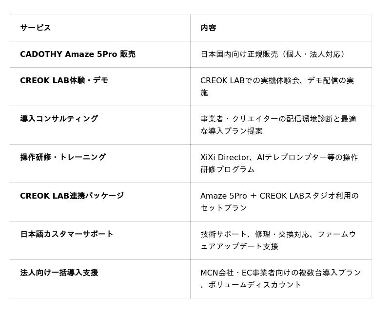 本提携の第一弾として、CREOKはCadothyのフラッグシップモデル「CADOTHY Amaze 5Pro」の日本国内における独占販売および導入支援を開始いたします。日本最大級のライブコマース専用拠点「CREOK LAB」への全面導入も同時に実施し、国内ブランド、クリエイター、EC事業者に向けた"プロ品質のライブコマース配信環境"の提供を本格化いたします。