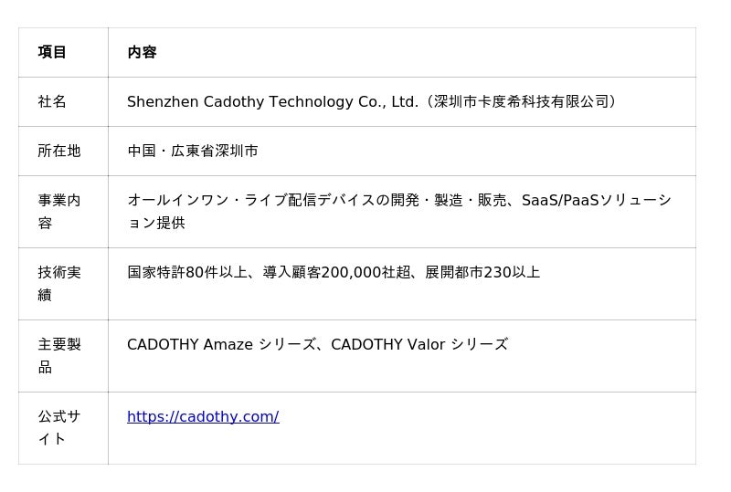 株式会社CREOK(本社:東京都江東区、代表取締役CEO:桜井 吉男、以下「CREOK」)は、オールインワン・ライブ配信デバイスのグローバルリーディングカンパニーであるShenzhen Cadothy Technology Co., Ltd.(本社:中国・深圳、以下「Cadothy」)と、日本市場における戦略的パートナーシップを締結し、Cadothy製品の日本総代理店に就任したことを発表いたします。
