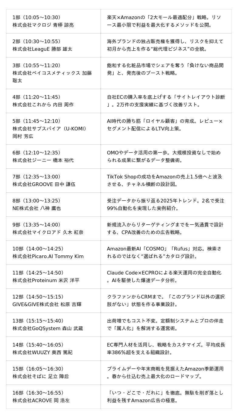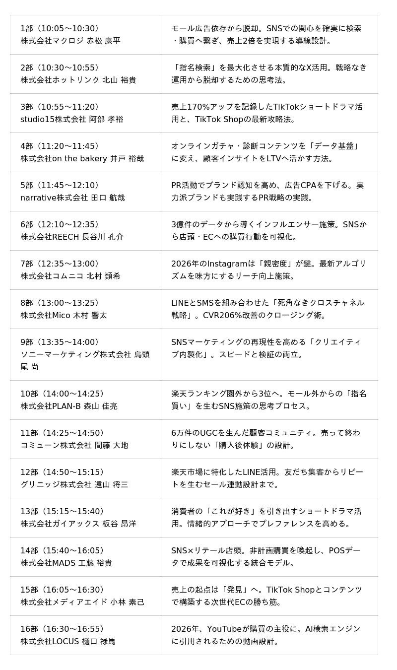 モール運用、自社EC、SNS活用、TikTok Shop、LINE、Amazon、楽天、CRM、UGC、動画戦略まで――新年度の売上成長に直結する全32講演を一挙公開