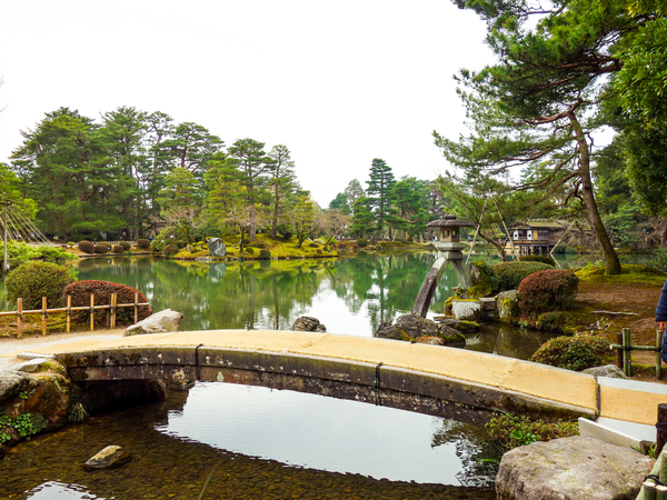 今回、観光客の姿を最も多く見かけた場所が「兼六園」でした。兼六園のシンボル2本脚の灯籠「徽軫灯籠(ことじとうろう)」と一緒に写真を撮ろうと、手前に架かる橋を右から左に渡る人が絶えませんでした。上記は観光客が写っていない、奇跡の1枚です。