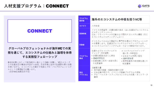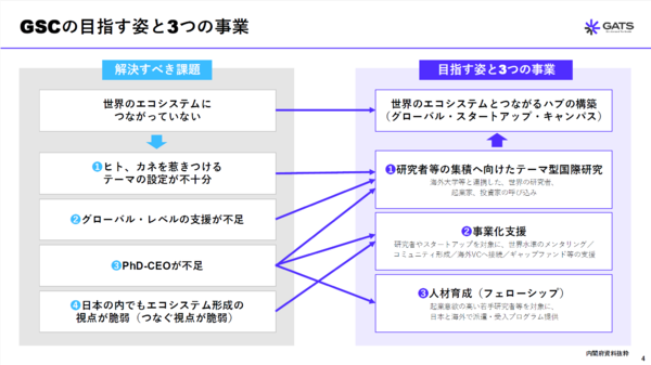 GSC構想は、①国際共同研究(米DARPA型)、②事業化支援、③人材育成――の3事業で構成される。このうち②と③を担うのが、GATSプログラムである。研究で生まれた成果を事業へとつなぎ、さらにそれを担う人材を育てる。従来は分断されがちだった「研究」「起業」「成長」のプロセスを一体で動かす設計となっている。