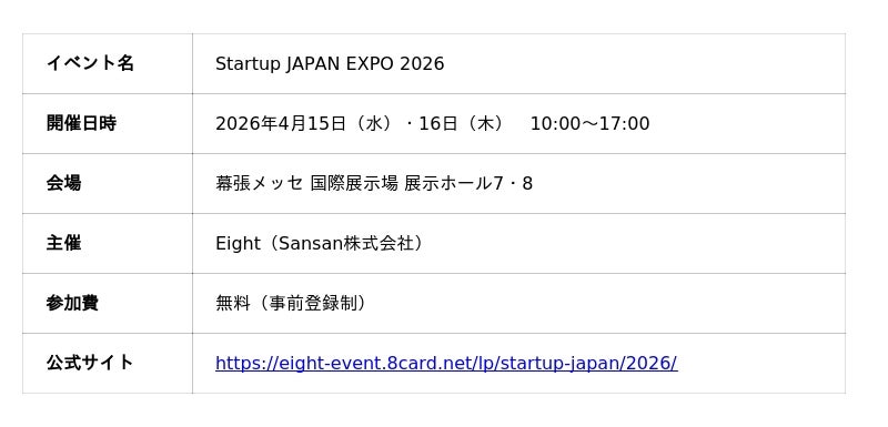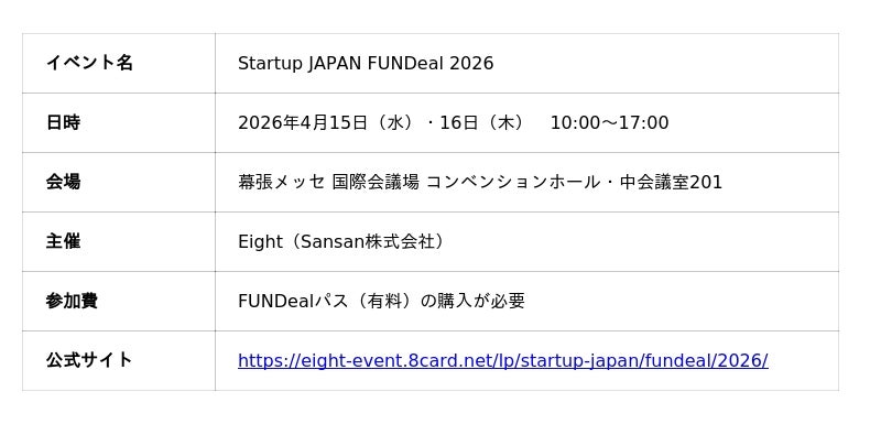 クオーク株式会社(本社:東京都渋谷区、代表取締役社長:前川 英之)は、2026年4月15日(水)・16日(木)に幕張メッセにて開催される「Startup JAPAN EXPO 2026」への出展、および協業・出資に特化したマッチング面談イベント「Startup JAPAN FUNDeal 2026」への参加をお知らせいたします。