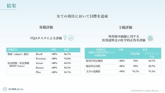 同社は2025年7月にGENIACに採択され、外科領域のAI開発に関し、自社開発した基盤モデルをベースに大量の術中画像と自然言語キャプションのデータセットを学習させることで、これまでにない機能を実装した国内初※2の外科特化型生成AI「Surgical VLM」を開発、その成果を実際の手術現場で実証しました。なお、開発したAIの評価にあたっては、慶應義塾大学病院の協力のもと、手術状況の的確な把握はもとより、外科医の育成にも重要と考えられる項目を整備しました。