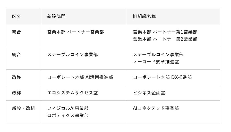 統合:営業本部において、当社製品の販売代理店への営業活動を担当する「第1営業部」「第2営業部」を「パートナー営業部」に統合します。「ノーコード変革推進室」を「ステーブルコイン事業部」に統合します。