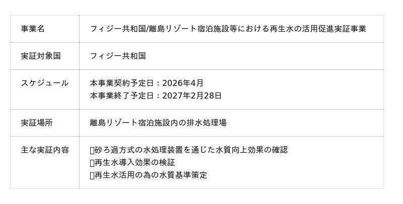 本事業の採択を受け、フィジー共和国の離島リゾートにおける再生水活用の実証をさらに深化させ、海水淡水化装置の稼働に伴う環境負荷の低減と経営コストの削減を両立する実効性の高い「再生水活用の循環型ソリューションモデル」を確立いたします。