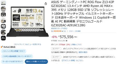 ASUSのゲーミングノートPC「ROG Flow Z13-KJP GZ302EAC」がAmazonで割引対象。参考価格611,405円のところ、6%オフの575,556円で販売中。
