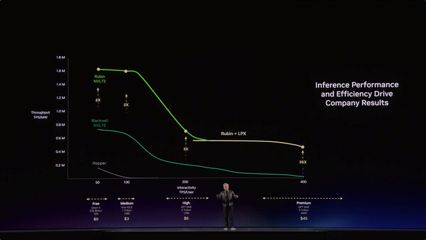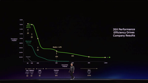 そこでNVIDIAはRubinにGroqのLPUを組み合わせることを決めた。実際Rubin単体でのLLMのスループットは、Blackwell比で2~10倍程度だが、ここにGroq 3 LPXを組み合わせることで、ユーザーあたり400 トークン/秒における性能をNVL72の35倍近くまで引き上げられる、としている。