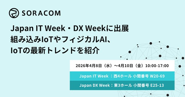 ソラコムは、4月8日から4月10日まで開催される「Japan IT Week【春】」および「Japan DX Week【春】」に出展する。これらのイベントは東京ビッグサイトで行われる。ソラコムは2つのブースで、最新のIoT技術やフィジカルAIといったトレンドを紹介するという。