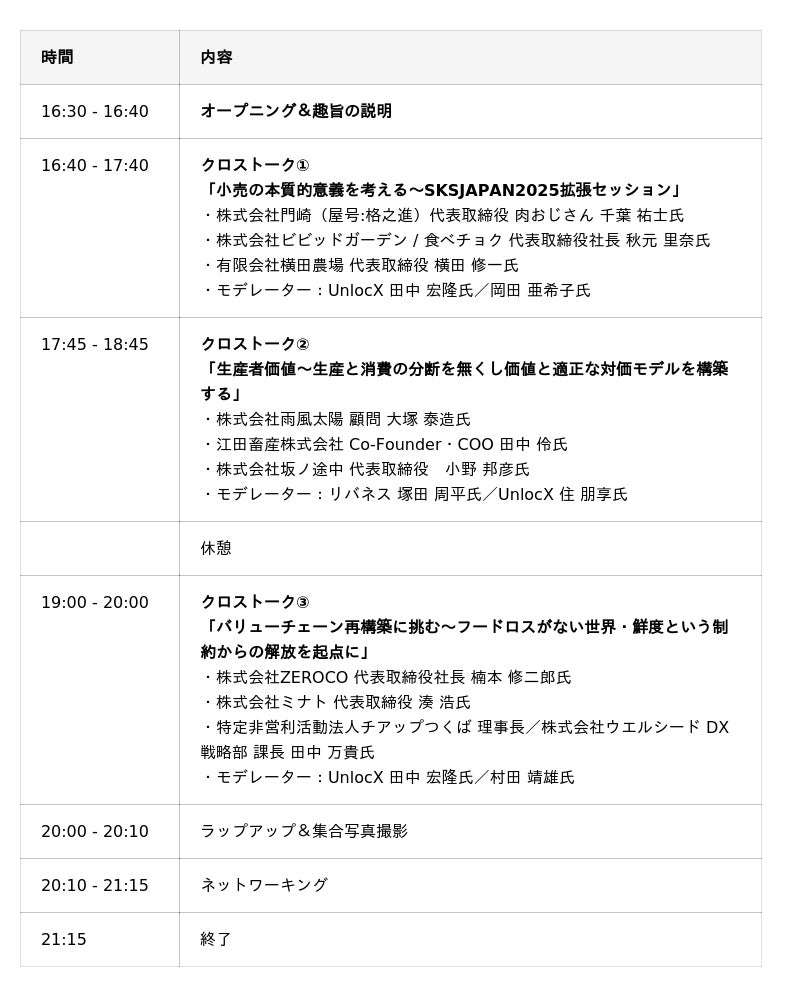 本イベントでは、生産・加工・流通・外食といった「食のバリューチェーン」全体を俯瞰し、その再構築に向けた具体的アクションを議論します。領域の垣根を越え、食のバリューチェーンのシステムチェンジに挑むチェンジメーカーをパネリストに迎え、「小売の本質的意義」「生産者の価値」「フードロス・鮮度からの解放」という3つの観点から各社の取り組みを紹介。現場で見えているにもかかわらず十分に可視化されていない課題や、現場で生まれつつある実践知・問いを持ち寄ります。