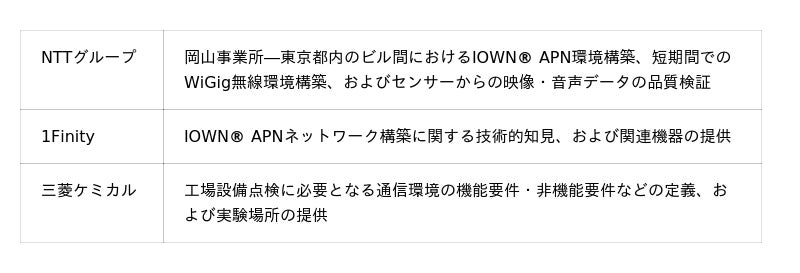 NTT東日本株式会社、NTTドコモビジネス株式会社、NTTドコモソリューションズ株式会社、株式会社NTTデータグループの4社 (以下、NTTグループ)、富士通グループの1Finity株式会社 (以下、1Finity)、および三菱ケミカルグループの三菱ケミカル株式会社 (以下、三菱ケミカル) は、IOWN(R) APN注1およびAIの活用によるスマートメンテナンスの実現を通じて、屋外に設置された工場設備を点検する作業員の負担軽減に取り組んでいます。